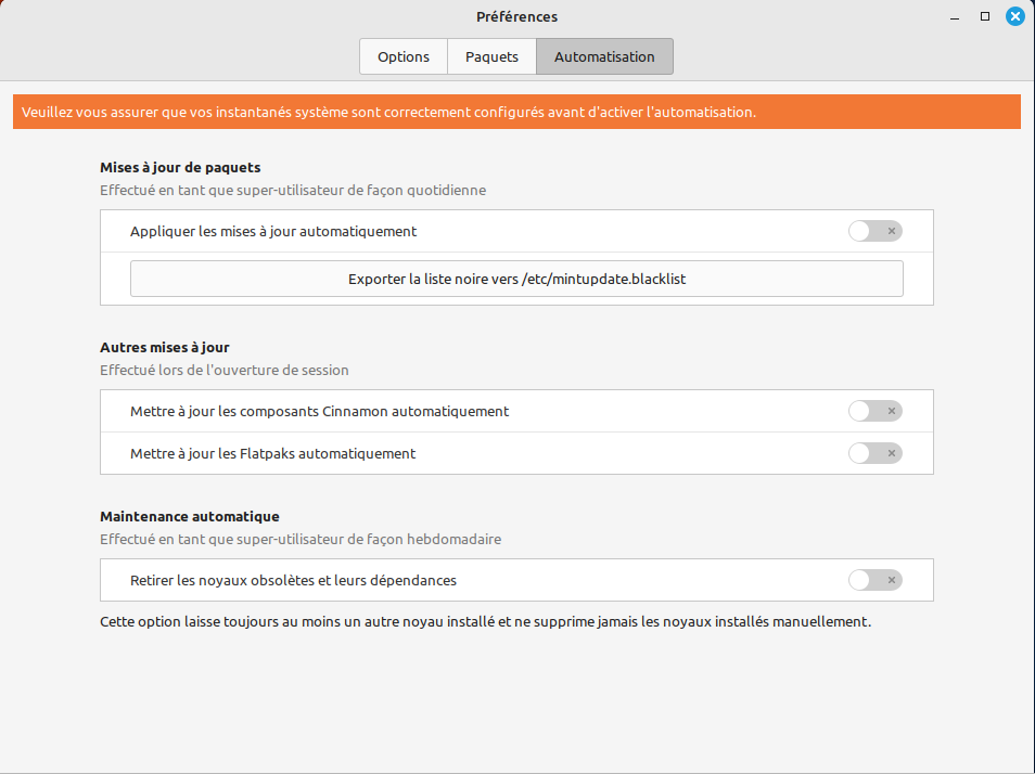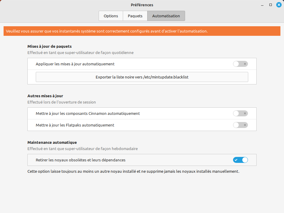 Dans la zone Maintenance automatique, il faut activer la ligne « Retirer les noyaux obsolètes et leurs dépendances ».
